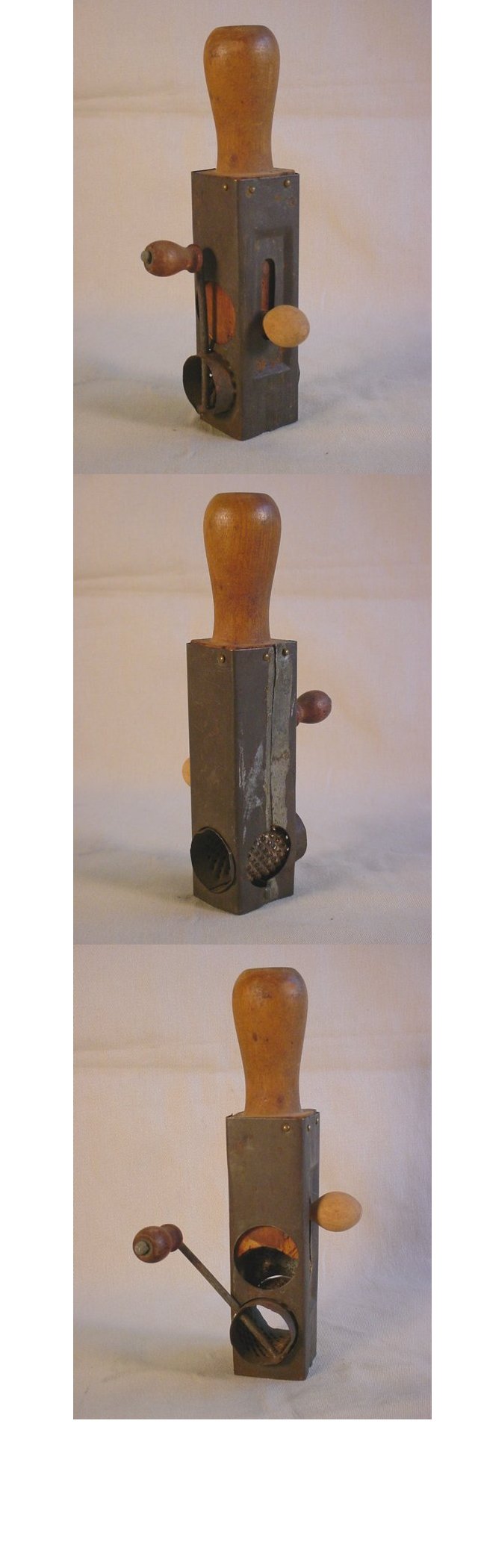 this nutmeg grater has a turned wood handle with a tin body. There is a