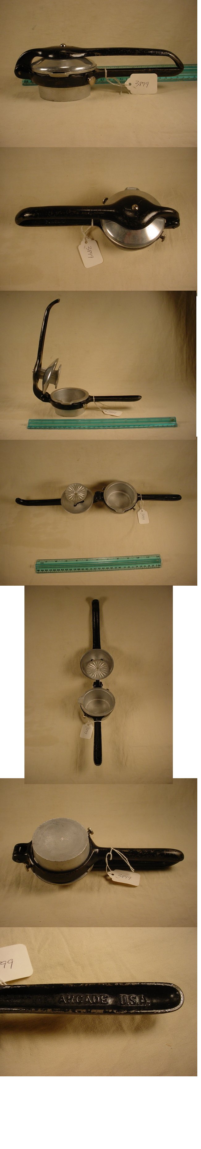 Manufactured by Arcade Mfg. Co. in Freeport, Illinois I would date this to the 20's or 30's. This squeezer is in very good all original condition and has a metal tub with a pour spout on one arm that is held in place with two thumb screws. On the other handle is a plunger with a lid that drops down over the lemon to cover it while it's being squeezed. Item No. 3899 |