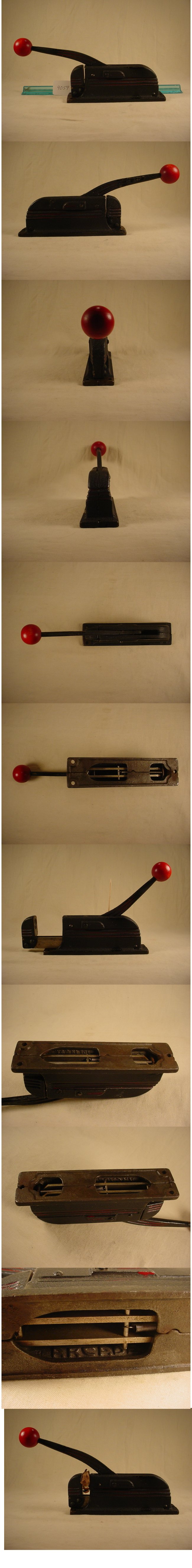 This is a rare #9514 deco style nut cracker designed and manufactured by Arcade. It is embossed with "Arcade" on the interior of the bottom along with "Made in USA" It has a red wooden handle, along with red highlights on the stripes. It is spring loaded and uses a ratcheting motion when applying pressure to the nut. It is designed with three holes in the base to be used as mounting points. An original ad can be seen here. Item No. 4059 |