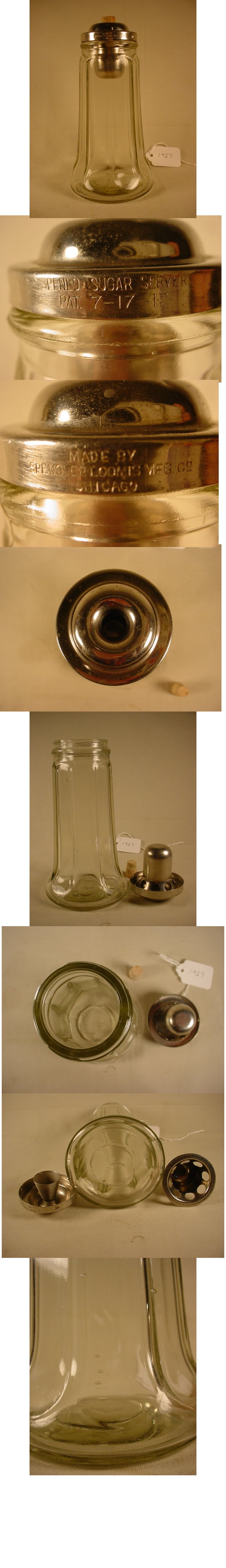 Spenlo Sugar Server/Dispenser A tall (about 6 3/4") deco style sugar shaker that dispenses a measured teaspoon from a storage area in the top with each tilt of the shaker. The dispenser is marked Spengler Loomis on one side and Spenlo Sugar Server with the patent date on the opposite side. The glass has the "I" inside a diamond mark of the Illinois Glass Co. This one came with a cork used as a stopper in the lid. There are bubbles, but no chips or cracks in the glass. Item No. 1927 |
