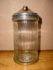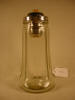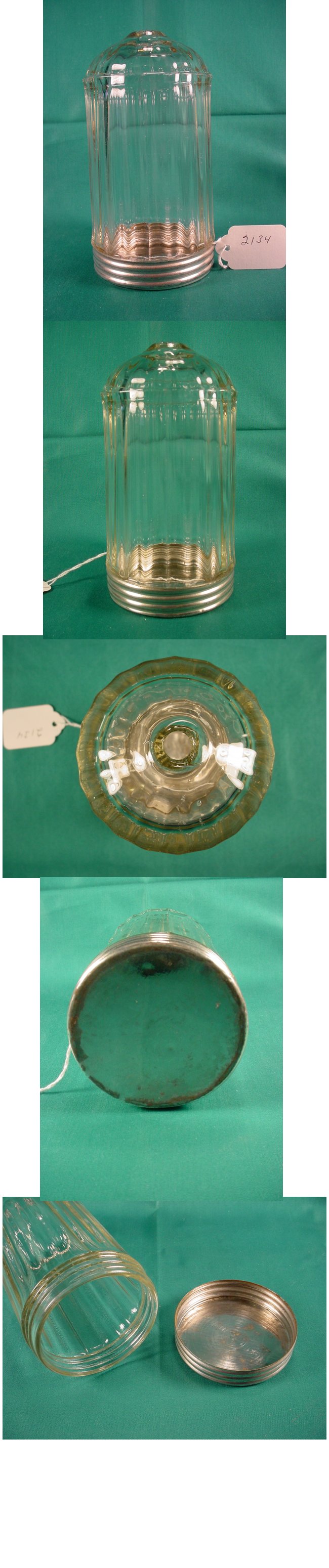 Bullet Sugar Dispenser This is an old "Bullet" style sugar dispenser which was most likely manufactured by Paden city. It is made with very thick clear glass and is very heavy (over a pound empty) with a tin screw on base. The glass is in great shape with a few very minor bumps on the ridges but nothing I would classify as a chip or crack. The screw on base threads on and off easily and has some wear to the original finish mostly on the exterior where it made contact with the table. Item No. 2134 |