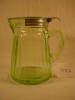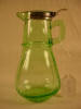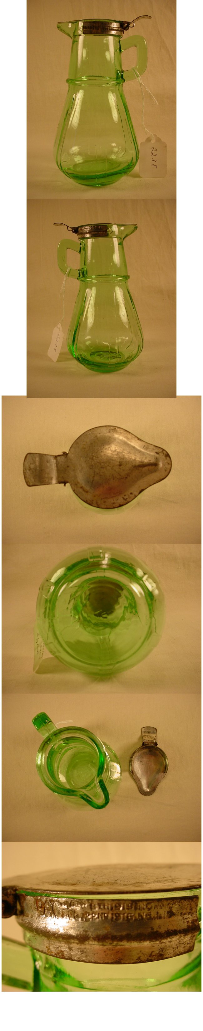 Hocking Glass Company Green Depression Syrup Dispenser A green glass syrup dispenser by Hocking Glass Co. It measures about 4 1/2" tall, has vertical ribs running down the sides of the glass and has a spring loaded tin lid. The only thing to report is a tiny flake off the edge of the spout and a few of the usual straw marks that are commonly found on depression glass. This one, as do most of these syrup dispensers has a line around the center of the handle that seems to have happened during the manufacturing/cooling process. Item No. 3832 |