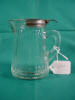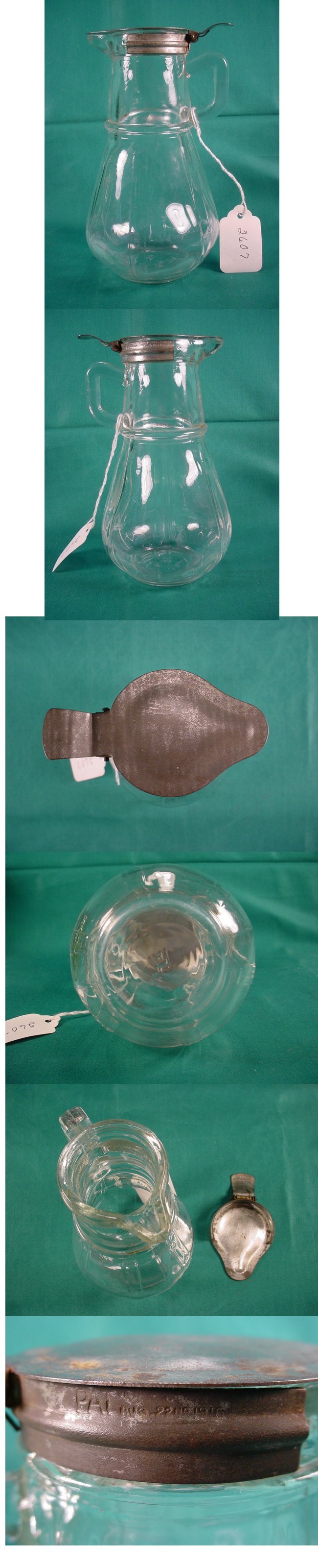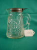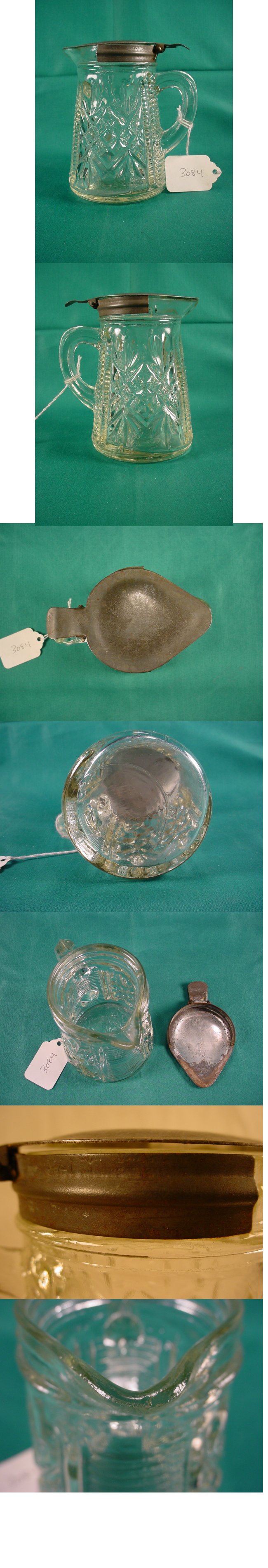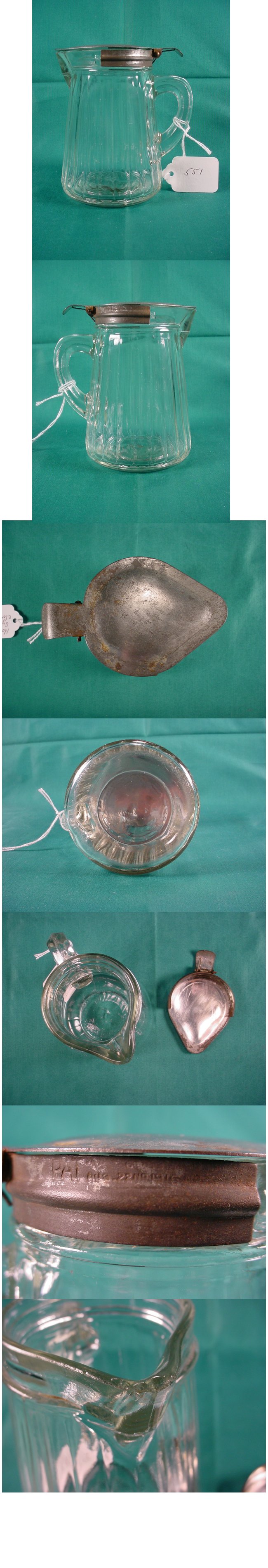 Hocking Glass Company Clear Depression Syrup Dispenser A clear glass syrup dispenser by Hocking Glass Co. It measures about 4 1/2" tall, has vertical ribs running down the sides of the glass and has a spring loaded tin lid. It has a few chips on the spout but will display nicely. Item No. 551 |