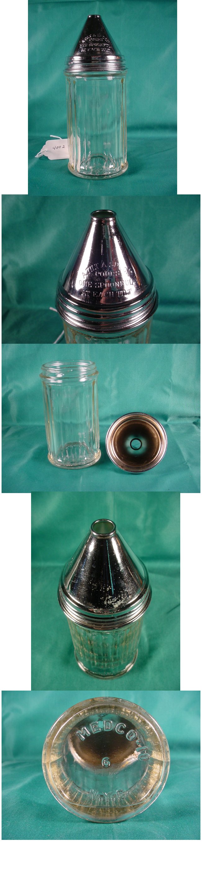 Measuring Device Co. Sugar Shaker This early shaker was made by the Measuring Device Co. of New York (MEDCO). They produced many different shakers over many years, but this is one of their earlier versions which includes a metal band around the base to protect it from chipping. There is some brass showing through on the metal and the metal band at the base is showing almost all brass. There is a screen insert that fits under the lid and helps to break up lumps of sugar for easier pouring. Item No. 2815 |