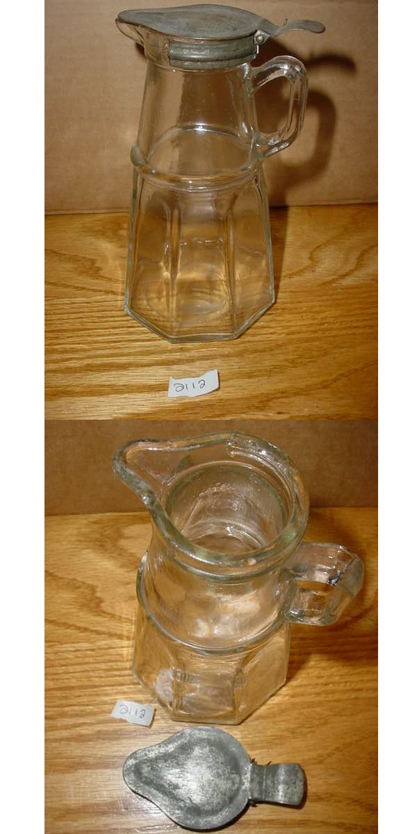 Hocking Glass Company Clear Syrup Dispenser I believe this syrup was made by Hocking Glass. It features flat side panels and a spring loaded tin lid. There are some chips under the lid of this syrup that are hidden when the lid is in place. Item No. 2112 |