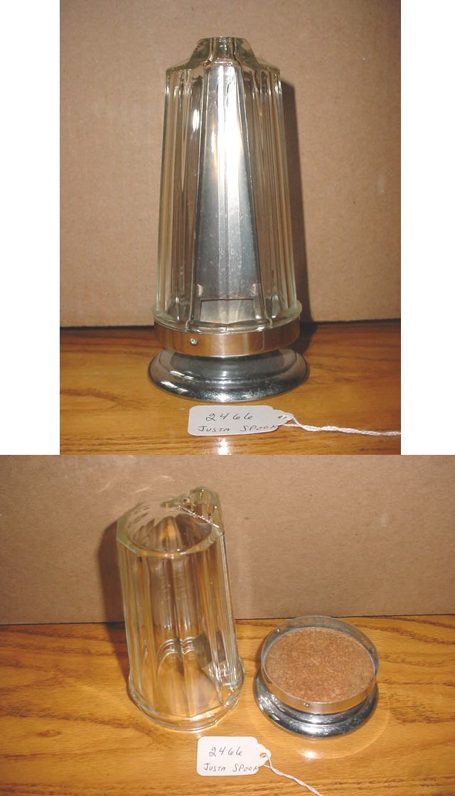 Just-A-Spoon Sugar Shaker An unusual deco style sugar shaker that dispenses a measured teaspoon with each tilt of the shaker. It has a pedestal base and a metal dispenser tube that measures the amount of sugar to be dispensed from the hole at the top. Item No. 2466 |