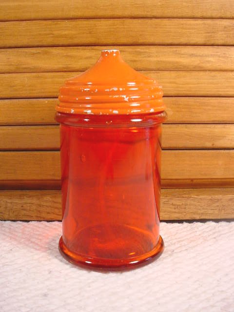 Orange Sugar Shaker There are no markings on this sugar shaker, but it is shown in Kitchen Glassware of the Depression Years along with the same shakers in either green or red. There is some paint loss on the lid, and some swirl marks in the glass that look like leftovers from another color of glass that they were using, but no chips or cracks. Item No. 1053 |